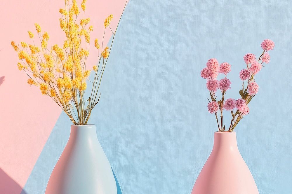 Zarte Farben verschmelzen harmonisch zu einem lebendigen Spiel aus Licht und Schatten. Die elegant geschwungenen Vasen, eine in sanftem Blau und die andere in zartem Rosa, verweben sich mit fröhlichen Blüten und schaffen eine frische, einladende Atmosphäre. Perfekt für das Wohnzimmer, bringt dieses Kunstwerk Lebensfreude und Stil in jeden Raum.