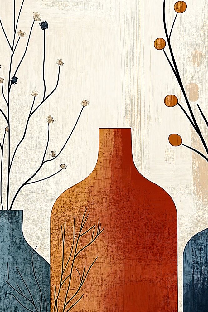 Eine stilvolle Komposition moderner Vasen in einer warm-kühlen Farbpalette aus Marineblau, Terrakotta und Ocker. Die minimalistische Illustration zeigt verschiedene stilisierte Vasen mit dekorativen Trockenblumen, die perfekt zwischen Abstraktion und erkennbaren Formen balancieren. Der texturreiche Hintergrund in sanftem Beige verstärkt die Ruhe des Ganzen.