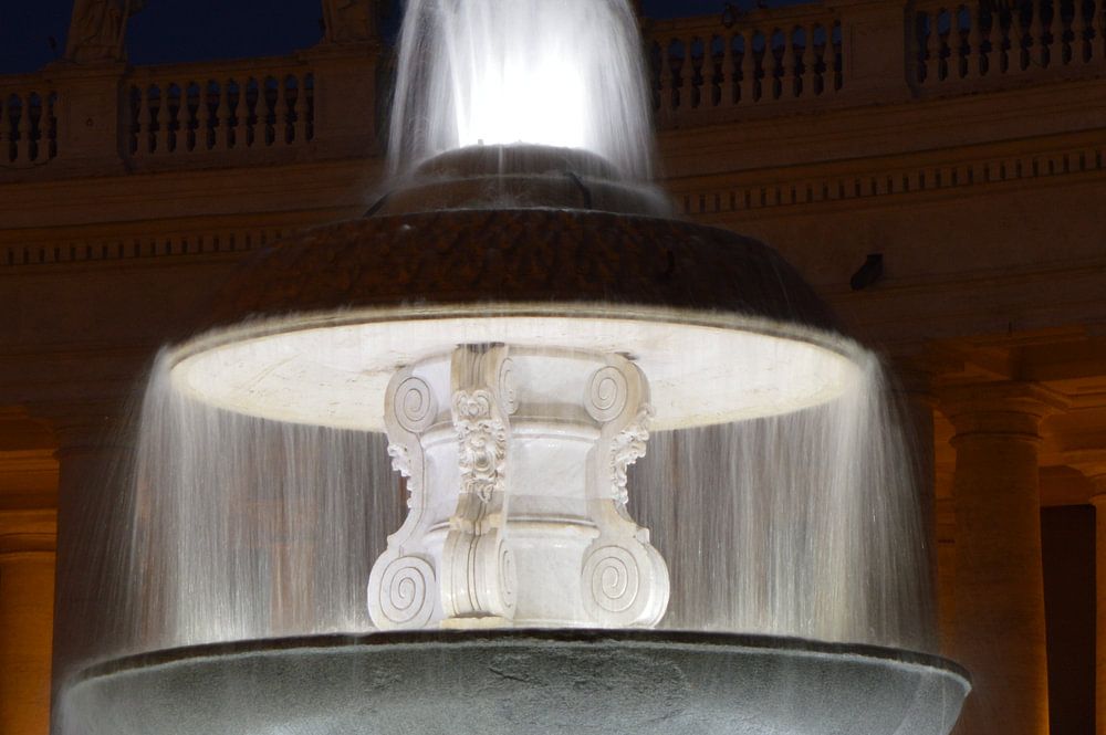 Mysteriöse Abendaufnahme eines Brunnens auf dem Petersplatz im Vatikan, Rom, Italien.