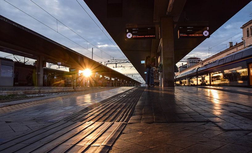 Abendsonne auf den Bahnsteigen des Bahnhofs Santa Lucia in der italienischen Stadt Venedig.