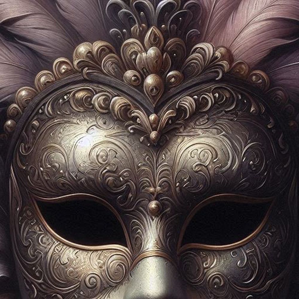 Ein digitales Kunstwerk einer venezianischen Maske, die traditionell im Karneval getragen wird. Sie ist in einem Vintage-Stil gehalten, der an alte klassische Gemälde erinnert. Die Maske ist mit großen Federn und Perlen verziert. Die Farben Violett, Braun und Silbergrau verleihen Ihrem Interieur eine schicke Note.