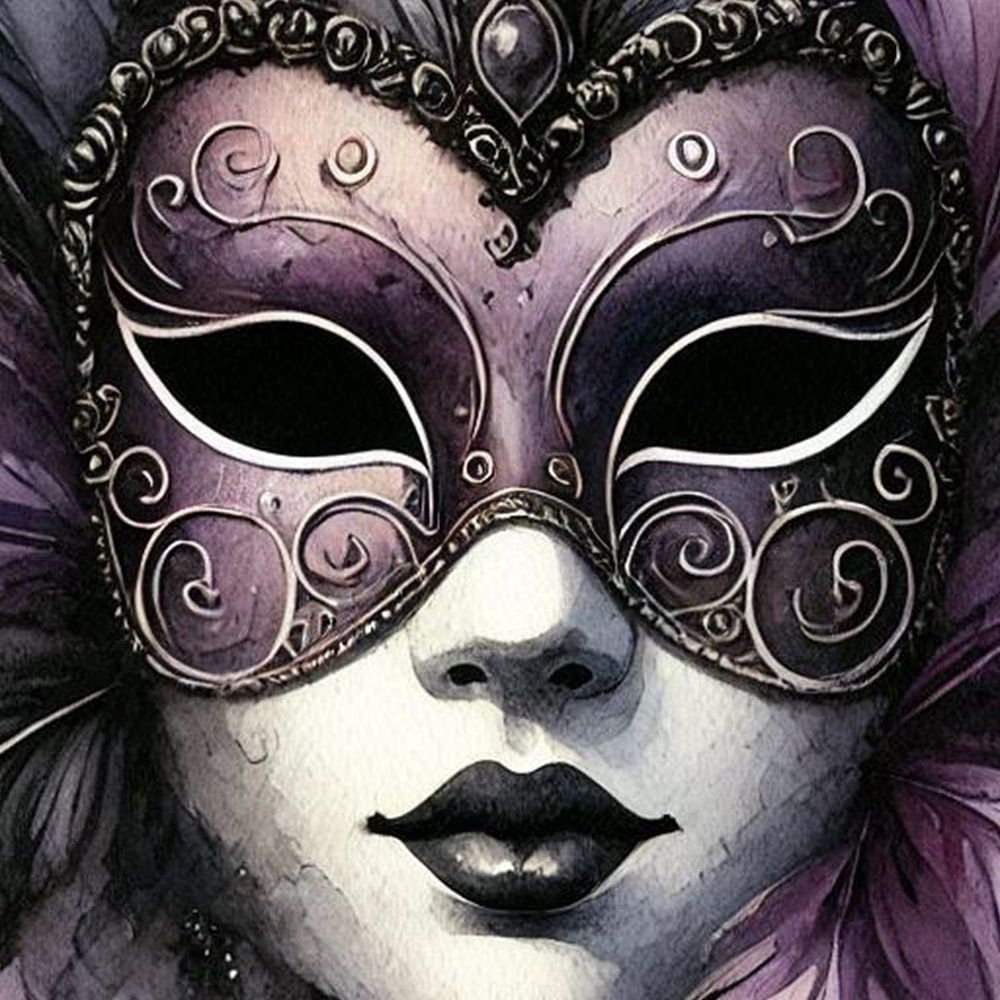 Ein digitales Kunstwerk eines weiblichen Porträts mit einer venezianischen Maske. Es ist im lockeren und fließenden Stil eines Aquarells in verschiedenen Farben gehalten.