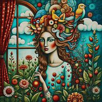 Dieses Gemälde zeigt die zarte Verbindung zwischen Mensch und Natur und fängt einen zarten und doch surrealen Moment ein, der zum Nachdenken und Staunen anregt. Im Mittelpunkt des Gemäldes steht das Porträt einer Frau, die ruhig und nachdenklich wirkt. Sie verkörpert die Verbindung zwischen den menschlichen Gefühlen und der natürlichen…