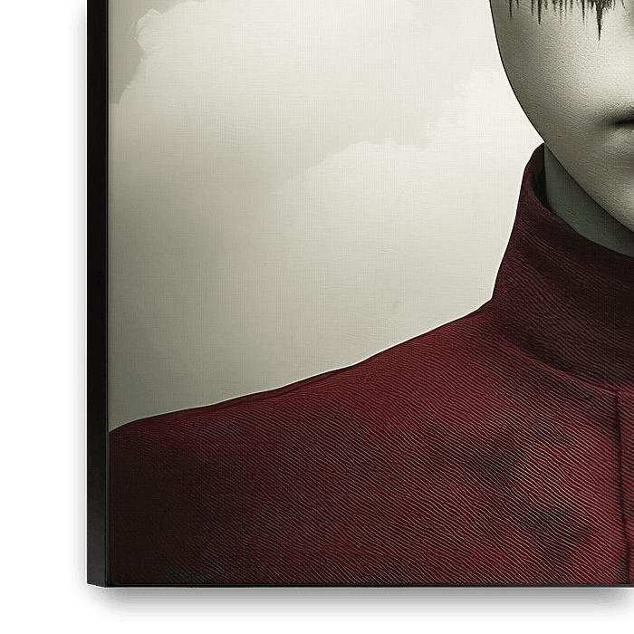 Die Frau auf diesem Bild wirkt sowohl mysteriös als auch verletzlich. Ihr Gesicht ist zur Hälfte von einem tiefschwarzen Fleck verdeckt, der wie die Silhouette eines kahlen Baumes geformt ist. Das Auge, das hinter diesem Fleck hervorlugt, scheint wachsam, fast furchterregend, während es den Betrachter direkt ansieht. Der rote Umhang der…