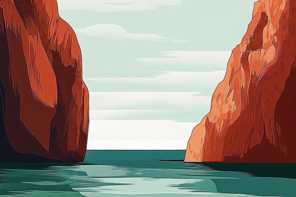 Eine ruhige Landschaft, in der imposante rote Klippen eine intime Bucht umgeben und in der türkisfarbenes Wasser sanft den Sandstrand küsst. Die warmen rostfarbenen Felswände kontrastieren wunderbar mit dem ruhigen Wasser und dem hellen Himmel, während vereinzelte Felsbrocken und dezente Vegetation für ein natürliches Gleichgewicht sorgen. Diese digitale Illustration fängt die Essenz eines verborgenen Paradieses ein, in dem Ruhe und Erhabenheit zusammenkommen.