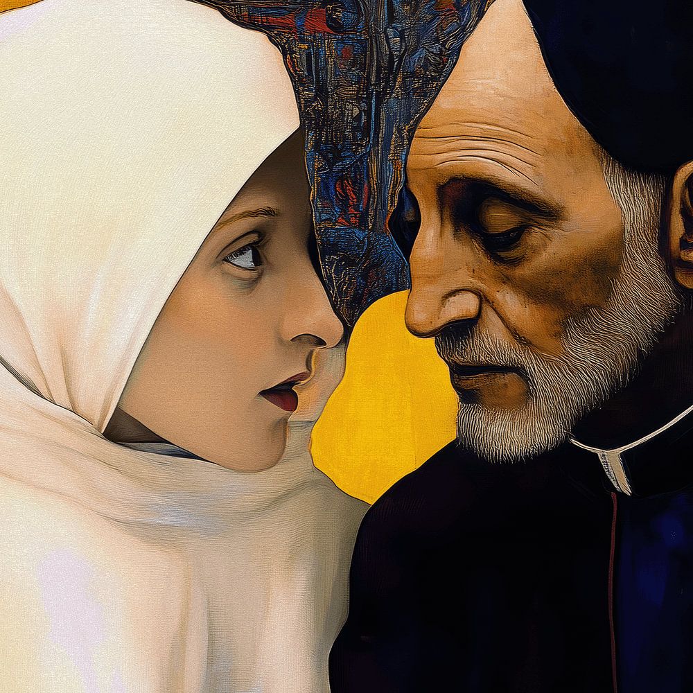 En laten we de mysterieuze liefde binnen de kerk niet vergeten. Dit portret vangt een gevoel van geheime connectie, waar de sfeer geladen is met onuitgesproken woorden en verlangens. De kleuren zijn rijk en diep, en de lichtval creëert een bijna heilige ambiance. De figuren lijken in een stille dialoog verwikkeld, hun blikken vol belofte en melancholie, wat de kijker uitnodigt om zelf deel uit te maken van hun verhaal.