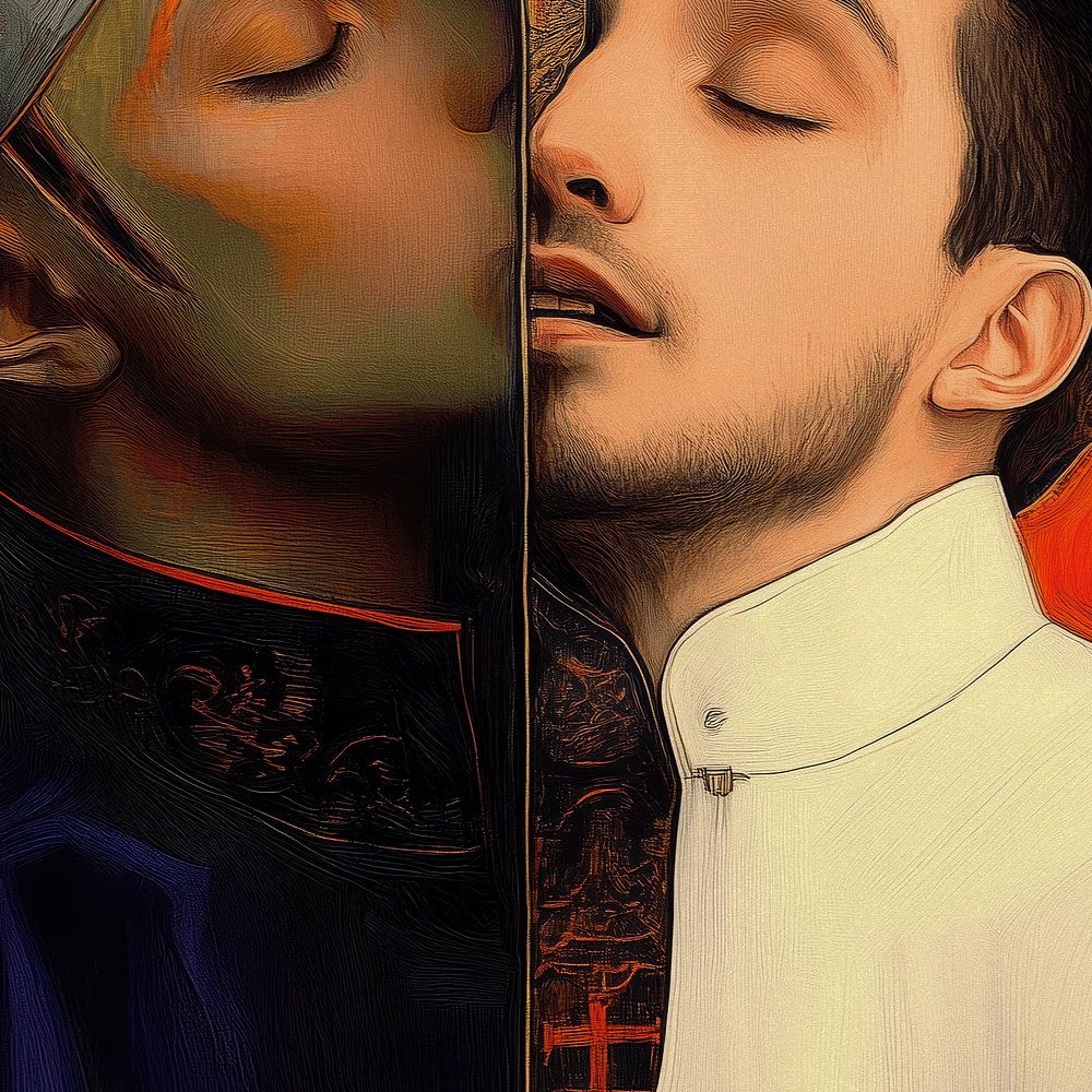 En laten we de mysterieuze liefde binnen de kerk niet vergeten. Dit portret vangt een gevoel van geheime connectie, waar de sfeer geladen is met onuitgesproken woorden en verlangens. De kleuren zijn rijk en diep, en de lichtval creëert een bijna heilige ambiance. De figuren lijken in een stille dialoog verwikkeld, hun blikken vol belofte en melancholie, wat de kijker uitnodigt om zelf deel uit te maken van hun verhaal.