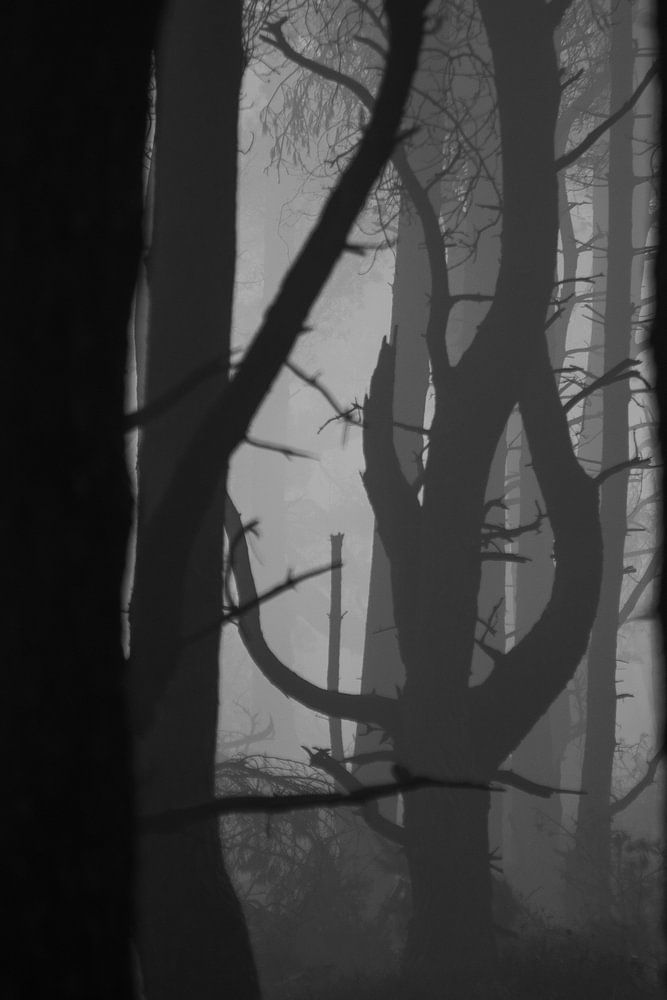 Es herrscht eine geheimnisvolle Atmosphäre in diesem nebligen Wald. Die Kurven in den Ästen dieser alten Kiefer unterstreichen die Atmosphäre.