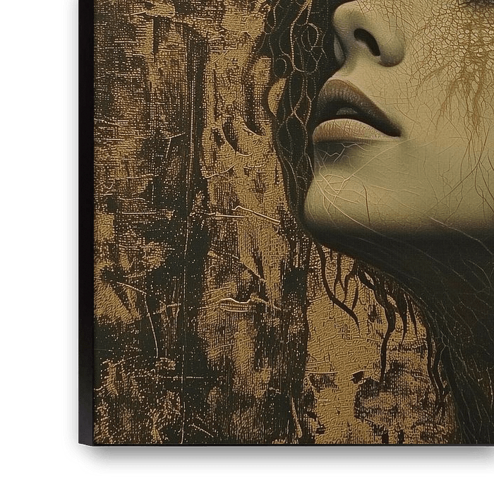Der Hintergrund, der aus erdigen Farben besteht, erzeugt eine raue, fast verwitterte Textur, die den Eindruck einer von der Zeit gezeichneten Wand erweckt. Dies verleiht dem Bild eine zeitlose Qualität, so als ob das Porträt auf einer alten Mauer gefunden wurde, die langsam von der Natur übernommen wurde.