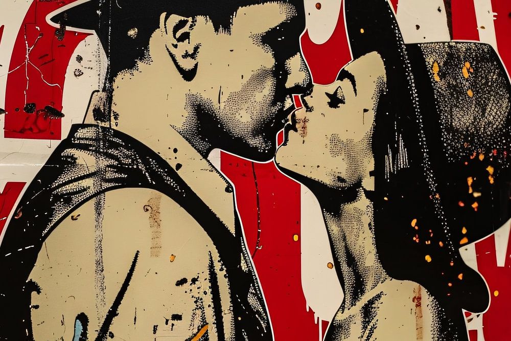 Dieses auffällige Kunstwerk bringt die lebendige Atmosphäre der Straßenkunst in jeden Raum. Es zeigt einen intimen Moment zwischen zwei Menschen vor einem Hintergrund aus fetten, zerrissenen Postern. Die Textur der abgeplatzten Farbe und die leuchtenden Farben betonen die Leidenschaft des Moments, während das Design eine zeitgenössische Interpretation der Pop Art bietet. Perfekt für Liebhaber moderner Kunst, die ihre Umgebung mit einem Werk inspirieren möchten, das sowohl Gespräche als auch Emotionen hervorruft.
