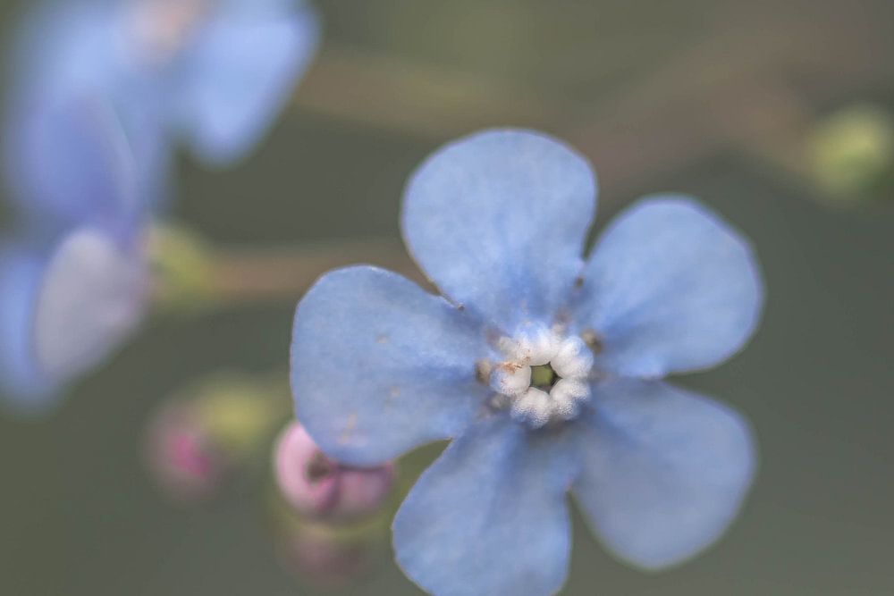 Nahaufnahme der Blumen der Vergissmeinnicht Heftklammern, mit zartgrünem Hintergrund