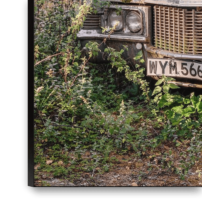 Bestelle das Foto Vergessener Luxus im Wald – Vergessener Luxus im Wald – ein amerikanischer Klassiker im Dornröschenschlaf von Gentleman of Decay als Reproduktion auf Leinwand, Alu-Dibond, als Poster, Fototapete oder Acrylglasbild.
