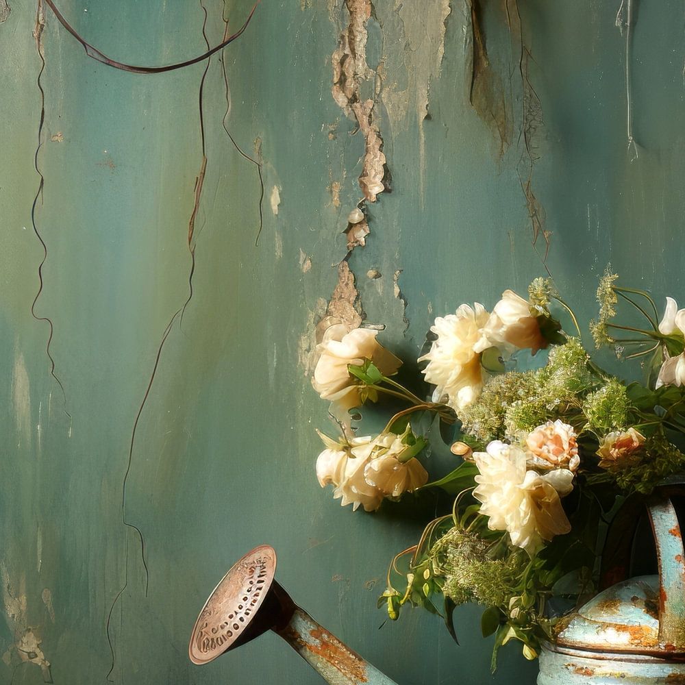 Een verroeste gieter uit vervlogen tijden trekt de aandacht, waaruit een prachtig boeket bloemen opbloeit. Tegen de achtergrond van een afgebladderde turquoise muur krijgt het tafereel een sfeer van vergeten charme.