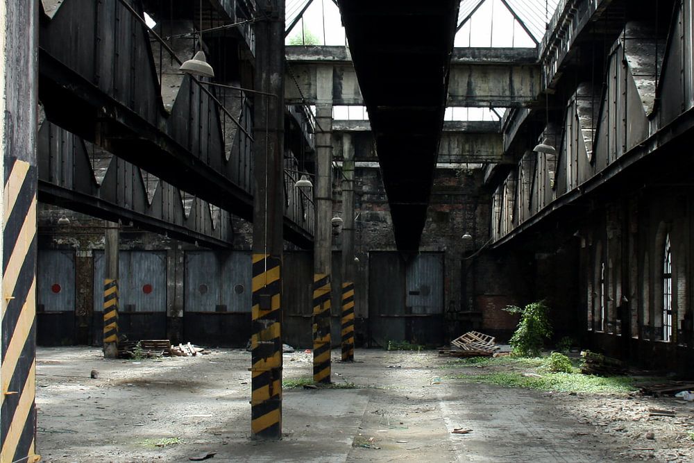 Offene Türen zu einer verlassenen Halle, die zufällig irgendwo in Belgien gefunden wurde.
