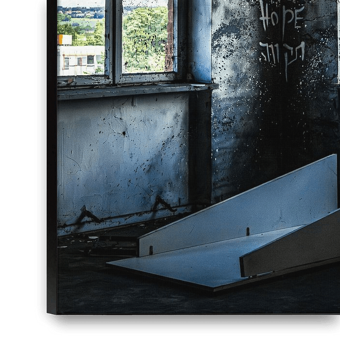 Bestelle das Foto Verlassener Raum mit Hope-Graffiti – Ein Symbol der Hoffnung im Lost Place von InfiniteArtLabs als Reproduktion auf Leinwand, Alu-Dibond, als Poster, Fototapete oder Acrylglasbild.