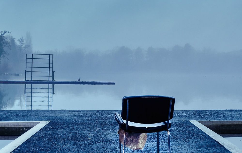 Das Wasser um sie herum scheint stillzustehen, als ob es die Zeit selbst eingefroren hätte. Der Schwimmteich wirkt menschenleer, ohne die übliche Fröhlichkeit der Menschen, die sich dort erfrischen oder spielen. Der Nebel macht es schwer zu sagen, wo das Wasser endet und der Himmel beginnt, so dass man den Eindruck hat, dass sich der Horizont in einer sanften Unschärfe verliert.