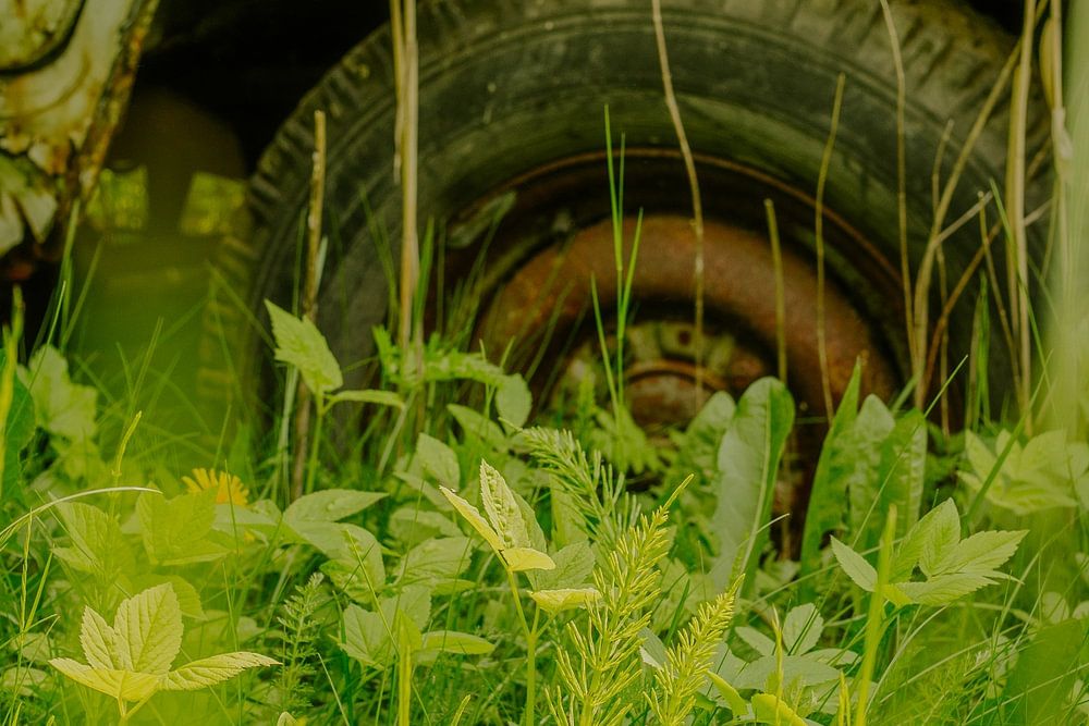 Nahaufnahme von rostigem Radkasten und Reifen, überwuchert von frischem Grün. Industrial‑Natur Fotokunst für Loft, Studio, Café oder Büro.