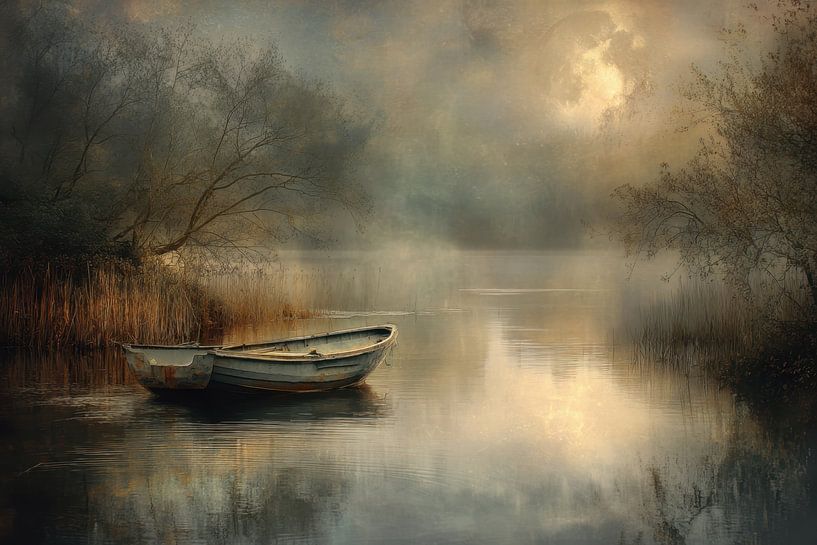 Dieses Kunstwerk zeigt ein kleines, leeres Ruderboot, das still am Rande eines Sees liegt, umgeben von Schilf und kahlen Bäumen. Ein sanfter Nebel hängt über dem Wasser und lässt den Hintergrund verschwimmen, während warmes Licht durch die Wolken bricht und sich auf der glatten Oberfläche spiegelt. Die Komposition besteht aus Wasser,…