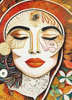 Auf der Leinwand "Seductive Shades of Autumn" ziert ein in Herbstfarben gehülltes Frauengesicht ein visuelles Fest der warmen Farbtöne, die die Natur malen, während der Sommer verblasst. Mit einem Lächeln, das sowohl schelmisch als auch weise wirkt, scheint die Frau die jahreszeitlichen Veränderungen…