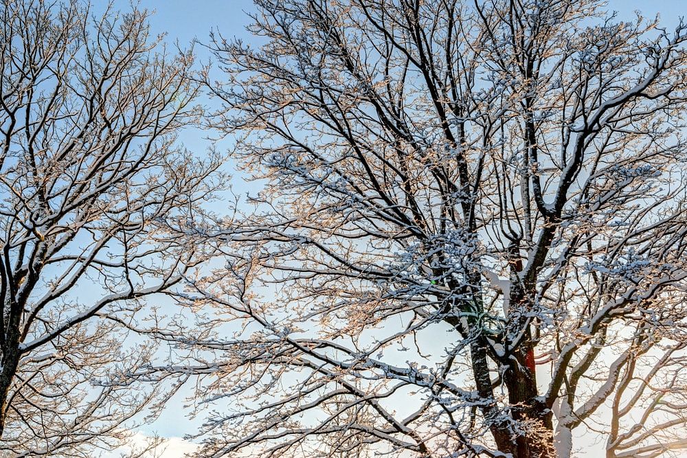 Verschneiter Wald in der Abenddämmerung. Nordeuropa.