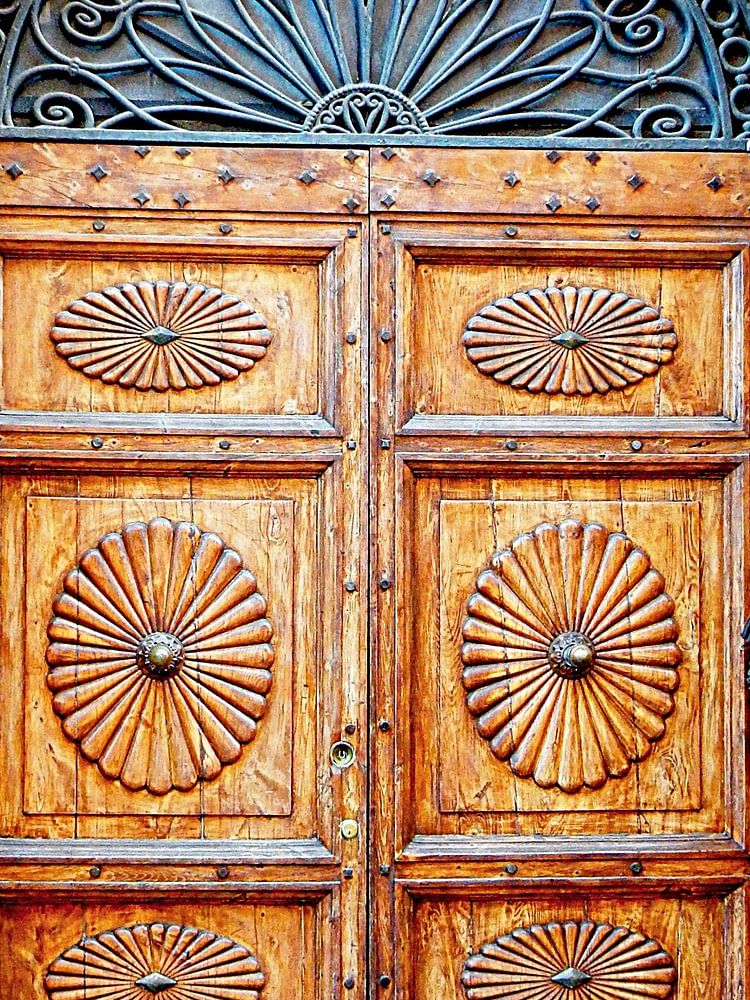 Diese wunderbare alte Holztür in Citta della Pieve, Umbrien in Italien, ist etwas von der Straße zurückgesetzt und hat einen wunderbaren Ziegelbogen, der zur Wand passt und durch eine Marmorstufe abgesetzt ist. Die Tür selbst ist aus robustem Holz, mit Schnitzereien, Metallknöpfen und Verzierungen. Das halbrunde Fenster über der Tür, das Licht in den dahinter liegenden Flur lässt, ist ebenfalls mit Metallverzierungen versehen.