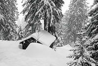 In den Bergen Frankreichs war diese versteckte Hütte inmitten eines Kiefernwaldes vollständig unter Schnee begraben.