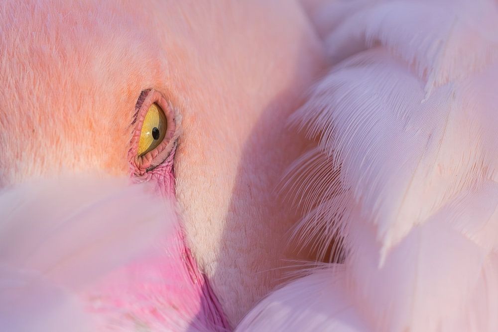 Zwischen Schichten aus samtweichen Federn hat sich der große Flamingo in einen Moment der Ruhe zurückgezogen. Sein Körper bildet einen schützenden Kokon aus pastellrosa Farbtönen, fast schwerelos im warmen Licht. Alles scheint still zu sein. Bis man dieses eine Auge entdeckt.