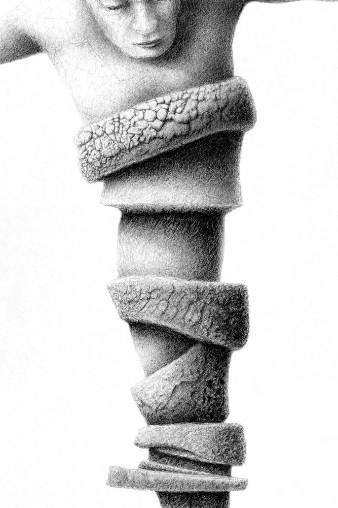 Petrified Balance ist eine Bleistiftzeichnung einer menschlichen Figur, die inmitten einer Spirale aus Steinringen ihr Gleichgewicht in der Stille findet. Der weiche, lebendige Oberkörper kontrastiert mit den rauen, rissigen Strukturen: Haut gegen Stein, Verletzlichkeit gegen Stärke. Die Arme strecken sich horizontal aus wie bei einem Seiltänzer; nicht um zu wanken, sondern um zu tragen. Der geräumige weiße Hintergrund spendet Licht und Atem und lässt die vertikale, spitz zulaufende Form eher aufsteigen als abstürzen. Das Werk vermittelt auch innere Stabilität: der Moment, in dem Schwere in Griffigkeit übergeht und Härte der Konzentration weicht. Es zeigt Widerstandsfähigkeit, Konzentration und die stille Kraft des Gleichgewichts.
