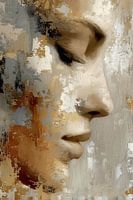 Ein fast ätherisches Porträt in Nahaufnahme, bei dem das Gesicht teilweise in einer vielschichtigen Farbtextur verschmilzt. Sanfte Beige- und Hauttöne bilden die Grundlage, während Akzente in Gold, Grau und warmen Erdfarben die Oberfläche durchbrechen. Die Augen sind geschlossen, was ein Gefühl von Introspektion und Hingabe hervorruft,…