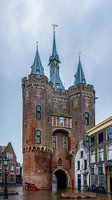 Vertorama (das ist ein vertikales Panoramafoto) des Sassenpoort in Zwolle. Zum Zeitpunkt der Aufnahme nieselte es, was dem Pflaster einen schönen Glanz verlieh.
