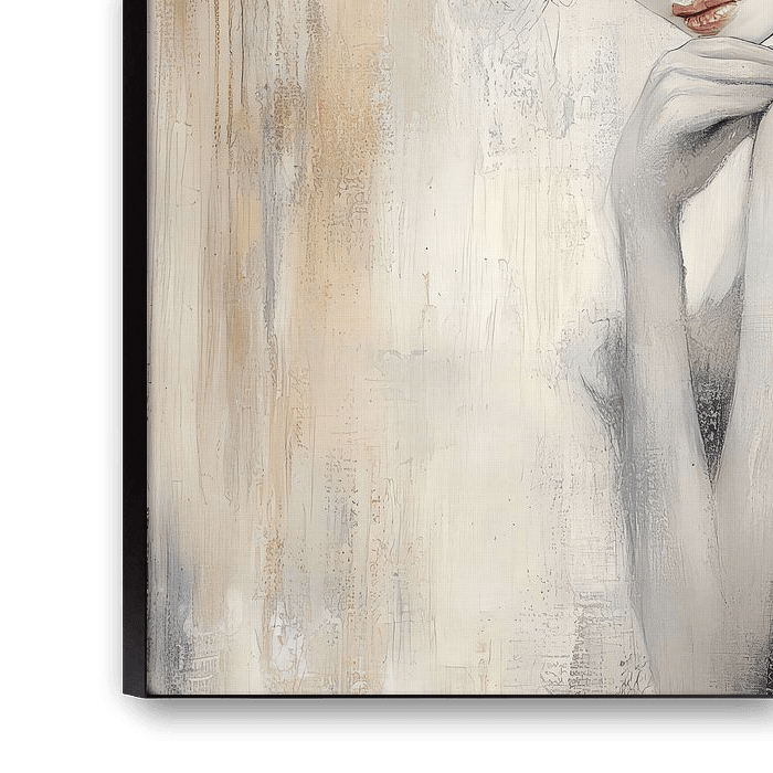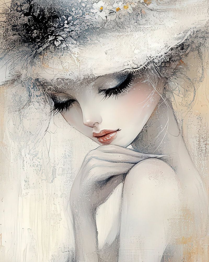 Ein romantisches Gemälde einer eleganten Frau, die einen weißen Vintage-Hut trägt und mit zarten Blumen geschmückt ist. Die sanften Pinselstriche und Pastellfarben verleihen dem Werk eine verträumte und nostalgische Note, ideal für Liebhaber klassischer und romantischer Kunst.