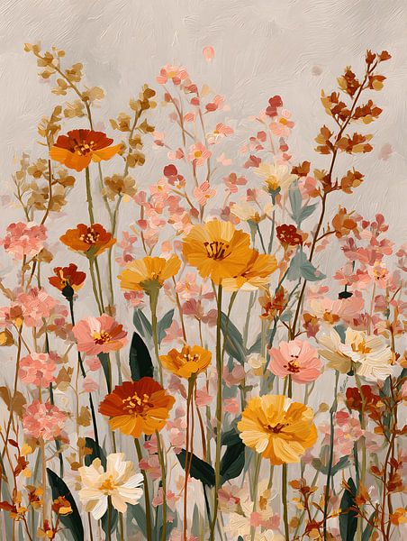 Eine poetische Blumenlandschaft mit schlanken Stängeln und sanften Pastelltönen. Dieses Werk wirkt ruhig und romantisch und lädt zur Entschleunigung ein. Ideal für ein Schlafzimmer, ein Arbeitszimmer oder eine ruhige Leseecke.