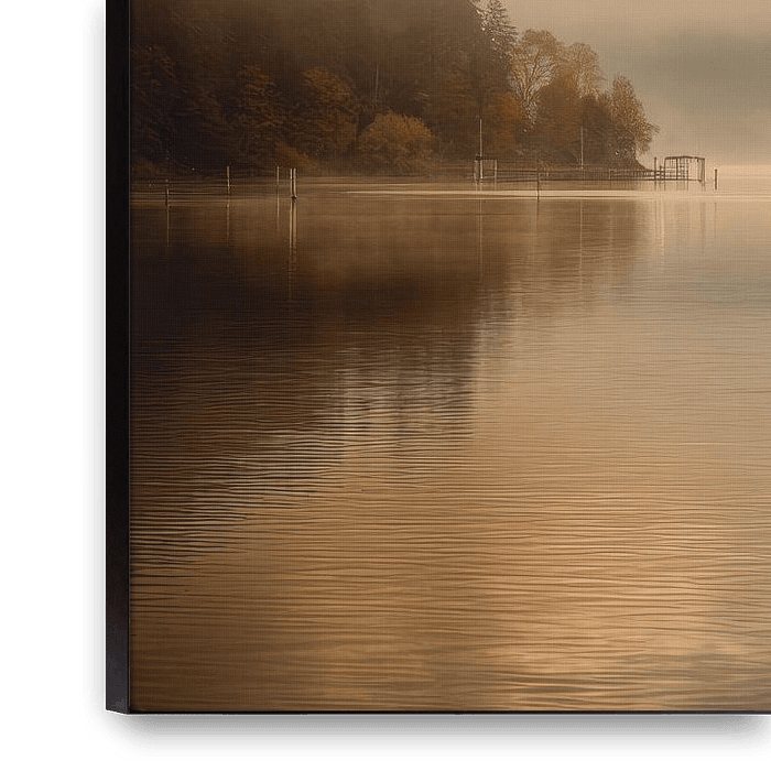 In dieser friedlichen Kunstlandschaft schwimmt ein kleines Boot auf einem ruhigen Bergsee, umgeben von Nebel und sanftem Morgenlicht. Die offene Komposition und die warmen Naturtöne verleihen dem Werk ein poetisches, beruhigendes Gefühl. Ein anspruchsvolles Kunstwerk, das Ruhe und Raum in jede Umgebung bringt.