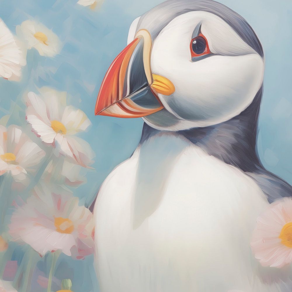 Ein Papageientaucher umgeben von Blumen. Die Pastellfarben und der geringe Kontrast sorgen für einen ruhigen Look.