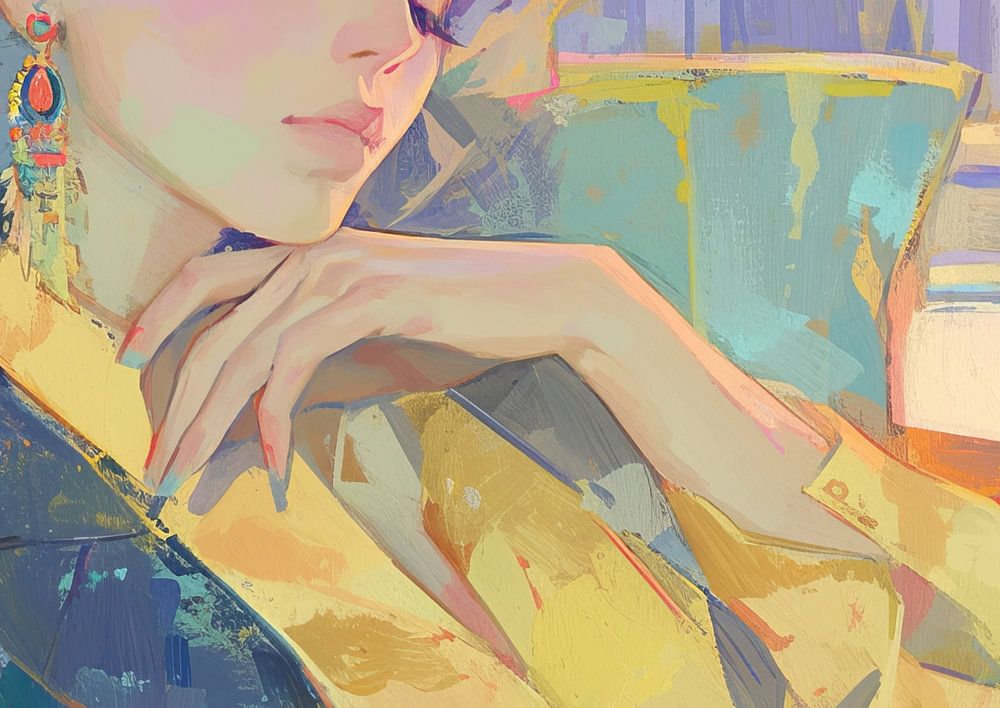 Dreamy Solace - Dieses Gemälde für Frauen zeigt eine verträumte Frau, die in Gedanken versunken in einem farbenfrohen und abstrakt illustrierten Stuhl sitzt, umgeben von einem Spektrum aus sanften Pastellfarben und lebhaften Farbakzenten, die eine ruhige und doch dynamische visuelle Erzählung schaffen.