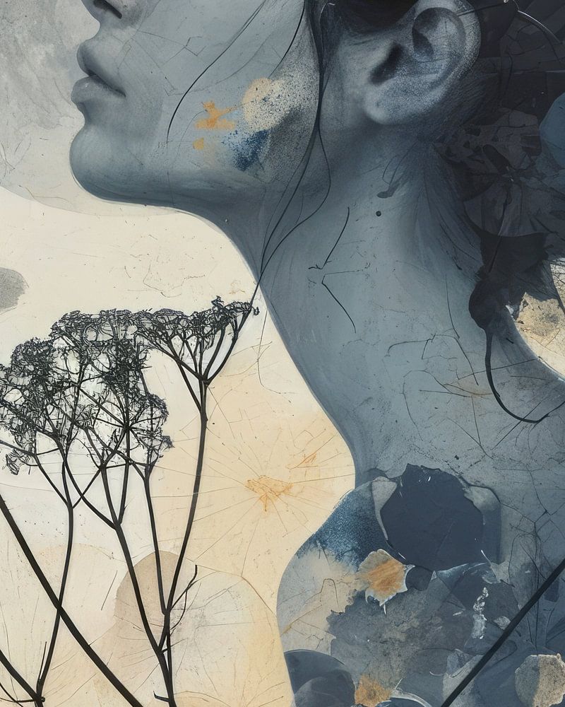 Verträumtes Portrait mit Blumen in Kobaltblau. Ein besonderer Blickfang. Wählen Sie die Größe und das Material für dieses Werk selbst und passen Sie es an Ihre Einrichtung an.