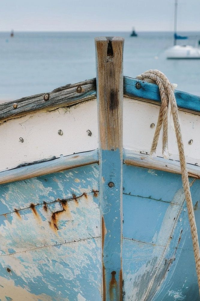 Das Bild zeigt ein charmantes, verfallenes Boot, das am Strand ruht. Die verblasste blaue Farbe und die rostigen Stellen erzählen Geschichten vergangener Abenteuer. Im Hintergrund schimmert das ruhige Wasser, während andere Boote friedlich treiben. Der alte Holzmast und das lose Seil verleihen der Szene einen Hauch von Vergänglichkeit und Nostalgie.
