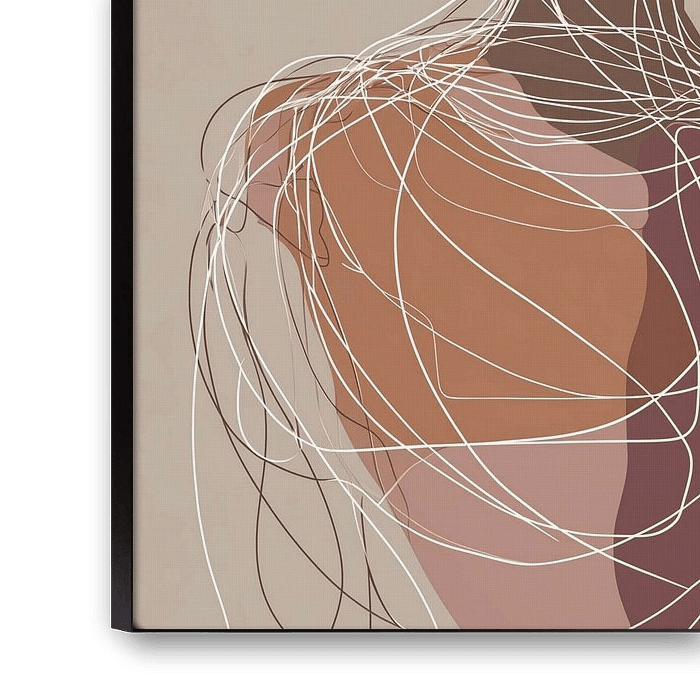 Verschlungene weiße Linien schlängeln sich um den Kopf und den Oberkörper wie ein visuelles Netzwerk aus Gedanken, Energie oder innerer Bewegung. Der Hintergrund ist ruhig, in weichen Beigetönen gehalten, während der Körper mit warmen Farbflächen in Rost, Terra, Altrosa und tiefem Violett ausgefüllt ist. Diese Farben verleihen der Figur Gewicht und Wärme, trotz ihrer transparenten und zerbrechlichen Linien.