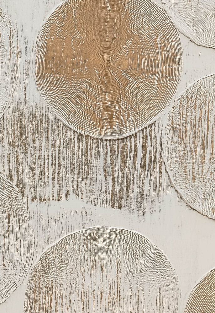 Sammlung von Kreisen in Erdtönen, die gleichmäßig auf der Leinwand verteilt sind. Die Kreise in Schattierungen wie Beige und Hellbraun haben eine interessante Textur mit subtilen vertikalen Streifen und verwitterten Oberflächen, die ihnen ein organisches, fast natürliches Aussehen verleihen. Diese Texturen verleihen jedem kreisförmigen Element eine taktile Qualität und verleihen dem Werk einen rustikalen und handgefertigten Charakter.