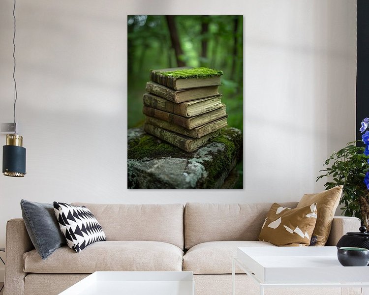 Dieses einzigartige Foto zeigt einen kleinen Stapel alter, verwitterter Bücher mit einer dicken Moosschicht auf den Einbänden, die eine fast märchenhafte Atmosphäre schaffen. In einer friedlichen, grünen Waldumgebung platziert, verströmen die Bücher ein Gefühl von vergangenen Tagen und rustikalem Charme. Die subtilen Farben des Mooses und des gealterten Papiers harmonieren wunderbar mit dem Grün der Umgebung. Dieses Bild ist perfekt für Liebhaber der Natur, der Vintage-Ästhetik und des Geheimnisvollen und passt gut in klassische oder rustikale Räume, in denen ein Hauch von Zeitlosigkeit geschätzt wird.