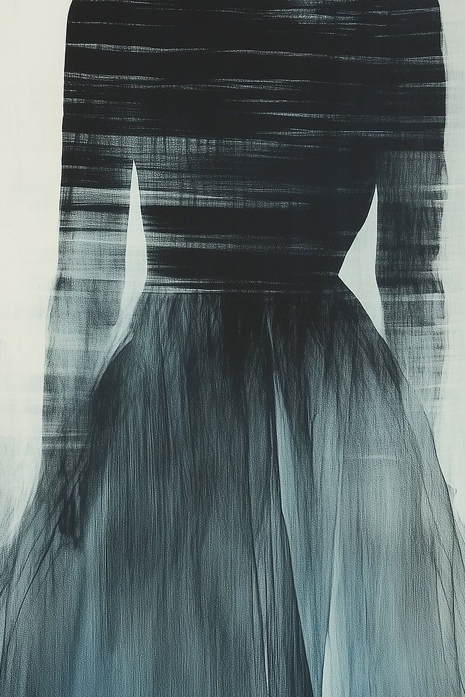 Ihre Arme sind mit hellen, horizontalen, durchscheinenden Streifen bedeckt, die sich wie eine subtile, fast ätherische Schicht über ihre Haut zu legen scheinen. Zusammen mit den dünnen vertikalen Linien am unteren Rand ihres Rocks unterstreichen diese Linien die Anmut und Eleganz ihrer Pose und vermitteln gleichzeitig ein Gefühl von Bewegung und Leichtigkeit. Der Rock selbst scheint aus einem durchscheinenden Stoff zu bestehen, der fast ätherisch wirkt und den Eindruck erweckt, die Frau befinde sich in einem Raum zwischen Realität und Traum.