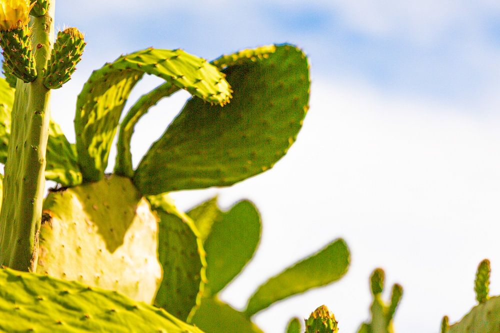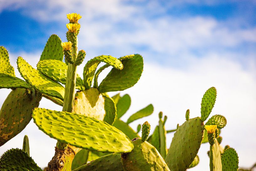 Diese ausdrucksstarke Naturfotografie zeigt einen Feigenkaktus in voller Blüte, dessen leuchtend gelbe Blüten im Vordergrund strahlen und sofort die Aufmerksamkeit auf sich ziehen. Die kräftigen Farben der Blüten bilden einen faszinierenden Kontrast zu den sattgrünen Kaktusblättern und verleihen dem Motiv eine lebendige, fast…
