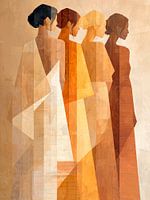 Ein Kunstwerk, das vier Frauen im Seitenprofil in einem minimalistischen und abstrakten Stil darstellt. Die Frauen tragen elegante, schwungvolle Kleider mit schlichten, geometrischen Formen. Die Farbpalette besteht aus warmen Tönen mit subtilen Schattierungen und Texturen. Die Gesamtkomposition ist harmonisch und stilisiert.