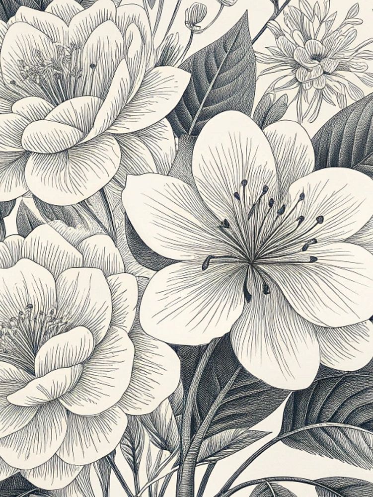 Diese exquisite schwarz-weiße botanische Illustration fängt die zarte Schönheit blühender Blumen und filigraner Blätter in einem Stil ein, der an klassische viktorianische Stiche erinnert. Das harmonische Arrangement aus eleganten weißen Blüten, knospenden Blumen und detailreichem Blattwerk vermittelt ein Gefühl von zeitlosem Charme und Raffinesse. Die feine Linienführung und die subtilen Schattierungen erzeugen eine atemberaubende visuelle Textur, die es zu einem fesselnden Werk für jeden Kunstliebhaber macht. Dieser Druck eignet sich perfekt, um Ihrem Wohn-, Arbeits- oder Schlafzimmer einen Hauch von Vintage-Eleganz zu verleihen und verkörpert botanische Kunst vom Feinsten.