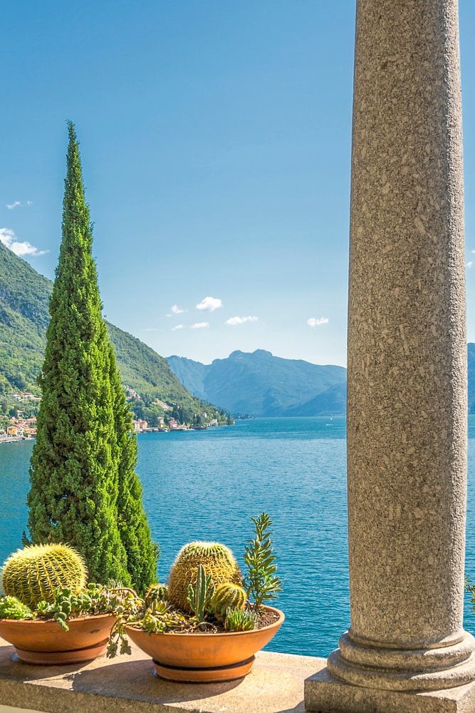 Der Charme des Comer Sees, gesehen von der Villa Monastero. Das Foto hebt die schöne Architektur und die üppige Bepflanzung mit Kakteen und Zypressen hervor, die einen natürlichen Rahmen für die atemberaubende Aussicht bilden. Der klare blaue Himmel und das ruhige Wasser des Sees spiegeln die Ruhe dieses bezaubernden Ortes wider.