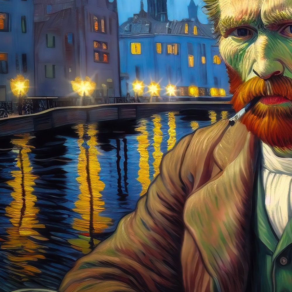 Vincent van Gogh sitzt mit einer Tasse Kaffee auf einer Amsterdamer Terrasse, als es am frühen Abend dunkel wird.