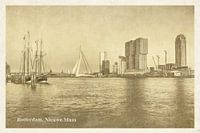 Der Fluss Nieuwe Maas war vor einem Jahrhundert schon da; das gleiche gilt für Segelschiffe, wie die auf der linken Seite. Dass es sich nicht um eine echte Vintage-Postkarte handelt, sondern um ein digital gealtertes Foto, zeigt sich an den Gebäuden rechts und in der Mitte des Bildes, darunter die Erasmus-Brücke, De Rotterdam und das…