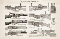 Dieser antike Druck aus der Zeit um 1900 zeigt eine große Anzahl von Querschnitten und offenen Modellen verschiedener Gewehre. Dazu gehören das deutsche Mauser-Gewehr, das amerikanische Lee-Gewehr (M 79) und das niederländische Infanteriegewehr M 71. Wir sehen Beispiele von Patronenlagern und Magazinen in verschiedenen Zuständen.