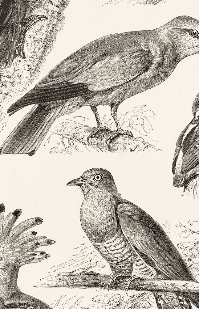 Dieser antike Kupferstich aus der Zeit um 1900 zeigt eine Reihe von Klettervögeln. Dazu gehören Spechte, Eisvogel, Wiedehopf und Kuckuck.