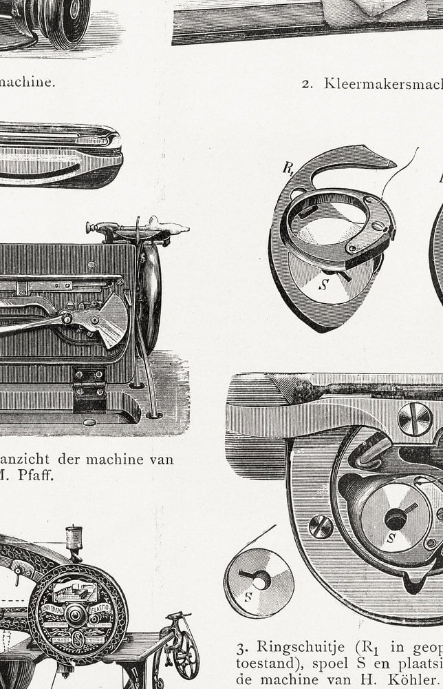 Diese Tafel aus der Zeit um 1900 zeigt einige Nähmaschinen, wie sie zu Beginn des 20. Jahrhunderts verwendet wurden.